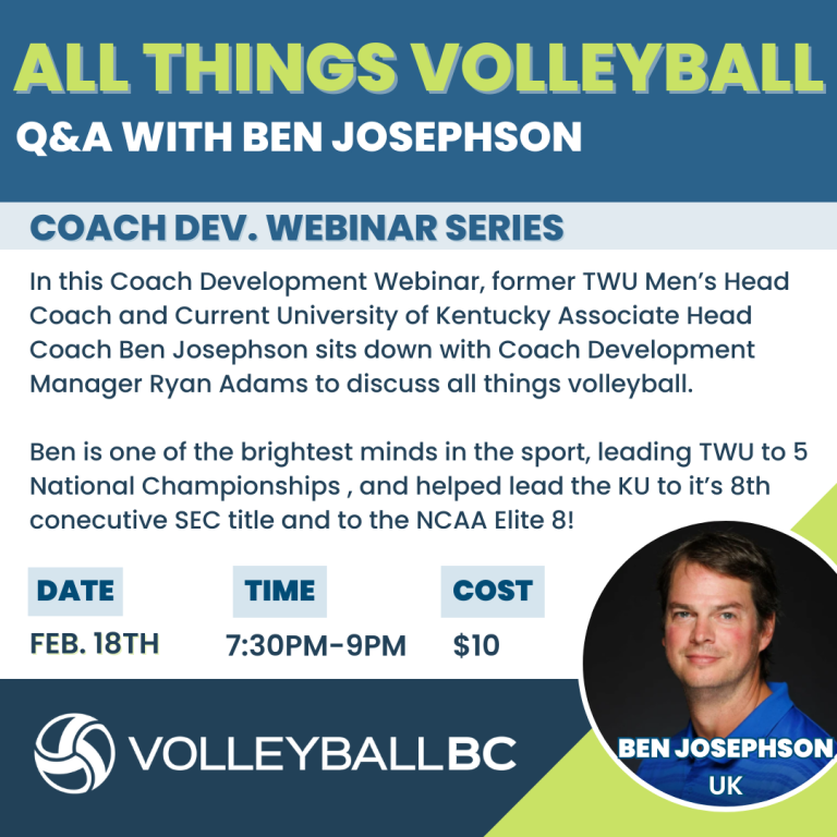 Welcome and thanks for being or wanting to be a Coach! What a privilege, opportunity and responsibility to lead young men and women in their growth and development as volleyball players but also people. Volleyball BC is dedicated to supporting you on your coaching journey!