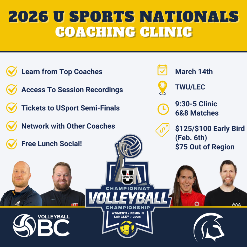 Volleyball BC is excited to partner with Trinity Western University to deliver the ultimate coaching experience during the 2026 U SPORTS Women’s Nationals weekend.